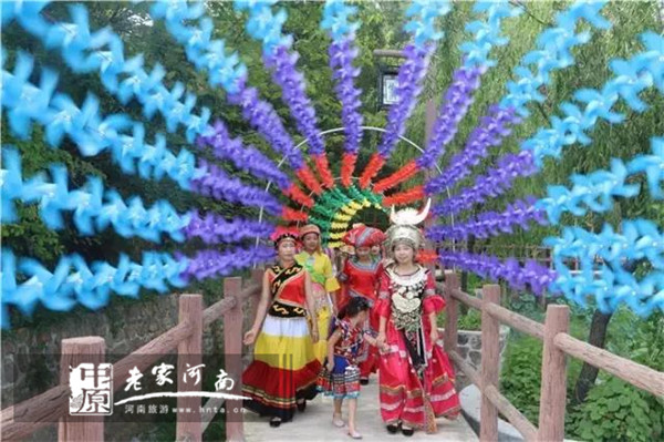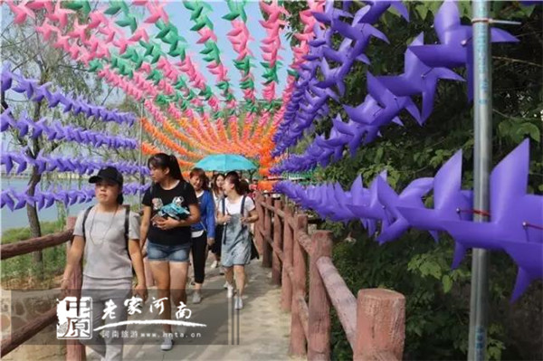 二郎山景區(qū)山清水秀、風(fēng)景怡人,是國(guó)家4A級(jí)旅游景區(qū)、全國(guó)青少年戶外體育活動(dòng)營(yíng)地、國(guó)家級(jí)森林公園,和石漫灘水庫(kù)山水相映,湖光山色美不勝收。景區(qū)依托得天獨(dú)厚的水資源優(yōu)勢(shì)建起了驚險(xiǎn)刺激的水上吊橋和中原最長(zhǎng)最美的親水棧道;增添了“少數(shù)民族風(fēng)情表演”、“龍舟競(jìng)渡”、“竹排漂游”、“傣族潑水狂歡”、“篝火晚會(huì)”、“3D電影體驗(yàn)”六大免費(fèi)娛樂(lè)項(xiàng)目。為了給游客提供更好看、更好玩、更靈動(dòng)的亮點(diǎn)景觀,景區(qū)用數(shù)萬(wàn)只七彩風(fēng)車,在親水棧道上拼出多彩畫卷,打造出了絢爛舞動(dòng)的七彩風(fēng)車長(zhǎng)廊。
