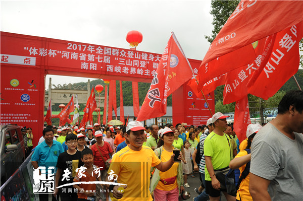 舞臺上節(jié)目表演的激情熱烈,舞臺下整裝待發(fā)的登山健兒躍躍欲試。隨著河南省體育局副局長梅寶菊宣布“2017年全國群眾登山健身大會暨河南省第七屆‘三山同登’南陽·西峽老界嶺登山健身大會”開幕,發(fā)令槍一聲令響,5000余名登山運(yùn)動(dòng)員開始健步登山。