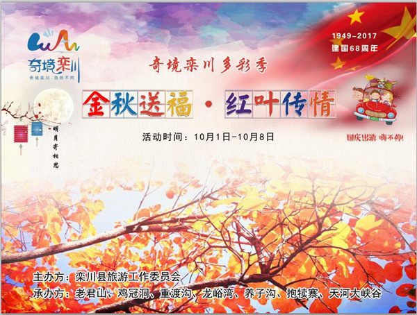 “國(guó)慶節(jié)·我跟祖國(guó)說句心里話”,“2萬斤山果贈(zèng)游客·共享金秋豐收喜悅”,“楓葉寄相思·明月傳真情”,“免費(fèi)為多代同游家庭拍全家福”等諸多感恩回饋活動(dòng)盡在“金秋送福·紅葉傳情”奇境欒川多彩季系列活動(dòng)。