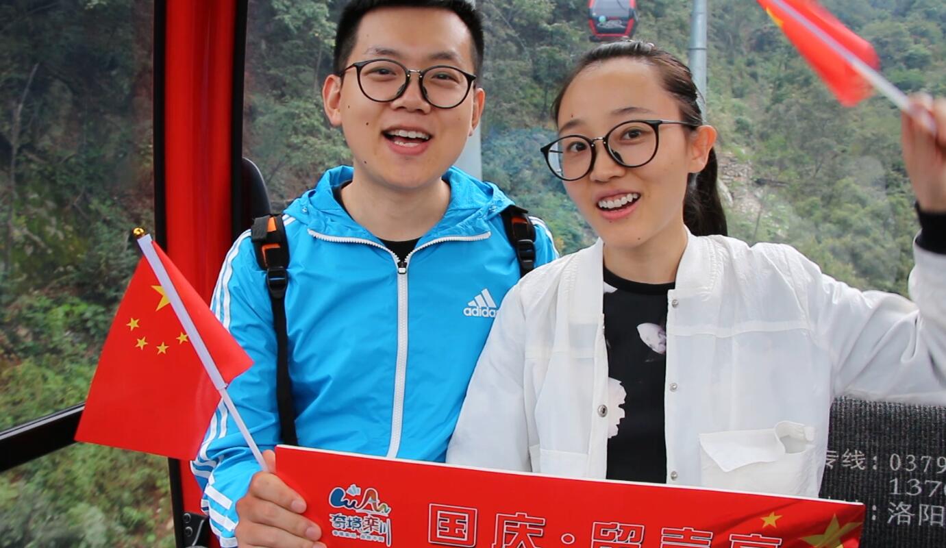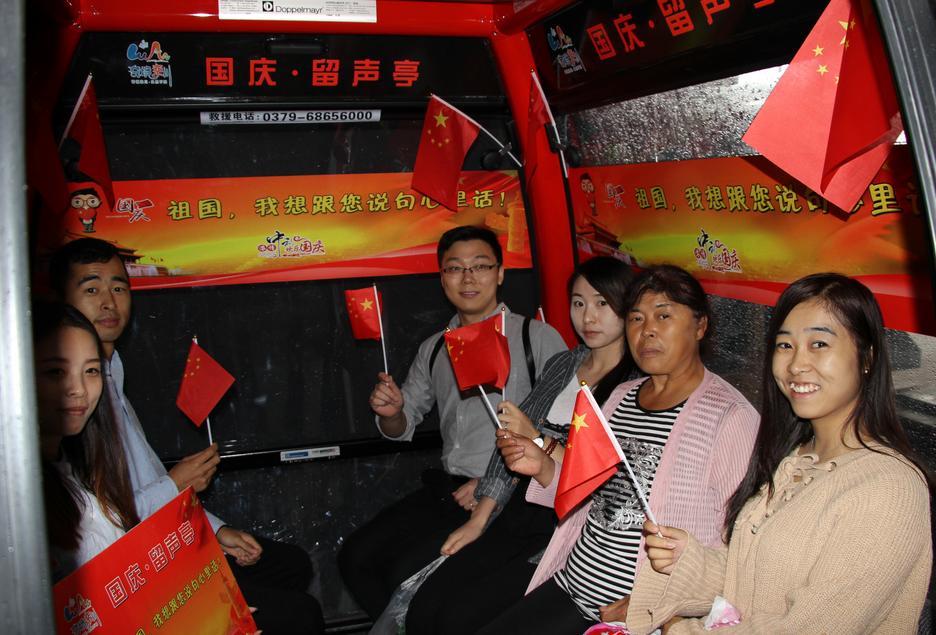 河南欒川現(xiàn)“國慶留聲亭”纜車,游客爭相為祖國送祝福