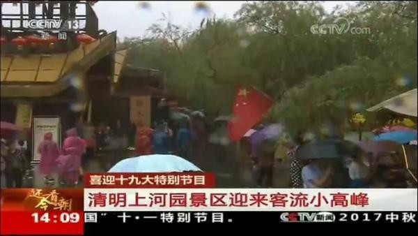 10月1日下午14:00時,中央電視臺推出的喜迎十九大特別節(jié)目《還看今朝•河南篇》在中央電視臺新聞頻道、央視新聞客戶端、央視移動新聞網、河南衛(wèi)視進行了同步直播。節(jié)目中,對清明上河園景區(qū)國慶節(jié)當天的游園狀況進行了現場報道。