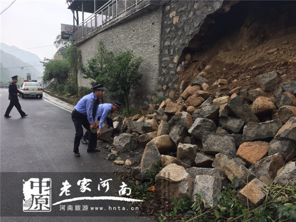 旅游警察清理滾落在道路上的落石