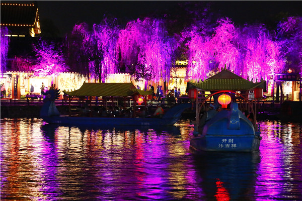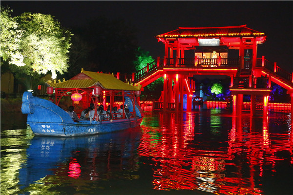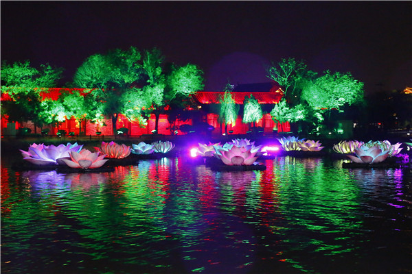 “霜落秋聲起汴河,西風(fēng)裊裊白頻波。”小船進(jìn)入一片荷花叢,驀然荷花綻放,燈光四起,遠(yuǎn)處悠揚的笛韻,岸邊旋轉(zhuǎn)的風(fēng)車,眼前強烈震撼的視覺沖擊,好一派大美風(fēng)光!