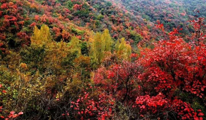 細雨洗滌,輕霧擁抱,當落日再次籠罩這片大地,仿佛烈焰紅唇親吻著魏巍太行。青山之上,火蝶般的紅葉挑染出片片深緋,陽光帶來的姹紫嫣紅,神奇地留在了黛眉。