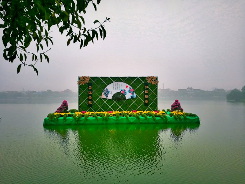 令人目不暇接的景點(diǎn)還數(shù)不勝數(shù)。如位于潘楊二湖水面上的《扇舞景悠》和《菊香裊裊》,以及位于龍亭大殿西側(cè)荷花池水面上的《湖光菊艷》,或依水造景,或貼波架橋,靈動(dòng)的水景與灼灼秋菊相映。再如位于龍亭大殿院內(nèi)的《瑞獸獻(xiàn)福》,一對(duì)“麒麟”東西相望,目如閃電,須眉飛揚(yáng),觀之令人震撼;而大殿院花圃內(nèi)、展廊中,則有眾多風(fēng)情萬種的珍稀菊花供游人品賞,有數(shù)萬“炫彩菊”和“乒乓菊”組成的“神女散花”“錦鯉躍水”“鳥鳴枝頭”“宮墻花窗”等各種造型更是令人贊嘆不已。