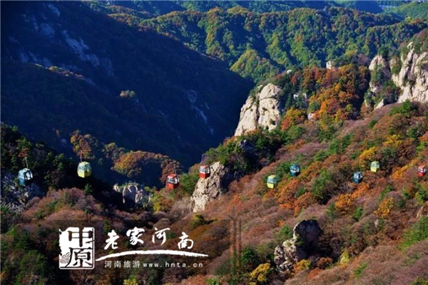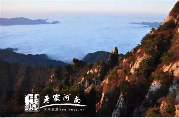 在十里畫屏這個(gè)如同童話夢境般的地方,色彩的豐富達(dá)到了讓眼球應(yīng)接不暇的程度。老君山的楓葉入秋經(jīng)低溫霜打后,葉色逐漸由青變黃、轉(zhuǎn)橙、呈紅、泛紫,往往一棵樹上就五色并存,是名副其實(shí)的“五彩楓”。有的還會(huì)呈現(xiàn)出淺絳、金黃、橘黃、橙黃、橙紅等美麗色彩,“似燒非煙火,如花不待春”的感覺油然而生。山頂?shù)牟Aв^景臺(tái)是最佳觀賞處。
