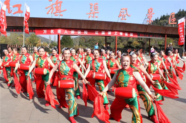 天氣轉(zhuǎn)涼,秋韻漸漸濃了起來,也喚醒了中老年朋友們出游的腳步。當日下午,紅旗渠景區(qū)廣場上熱鬧非凡,合著熱烈豪邁的腰鼓,數(shù)千名老人齊聲放歌,演繹《歌唱祖國》,現(xiàn)場觀眾紛紛拍照留念,記錄這壯觀而美好的瞬間。