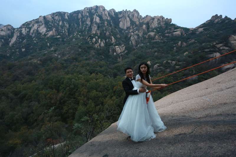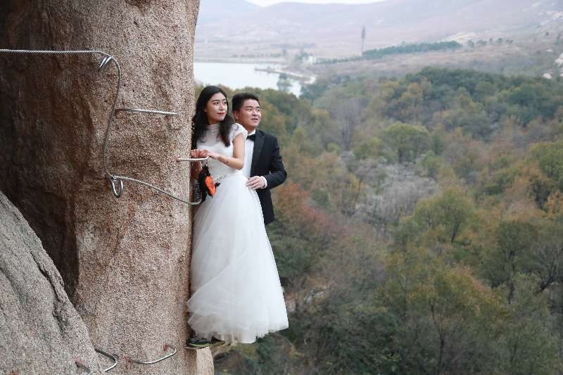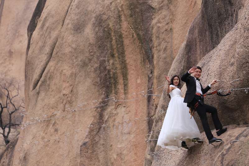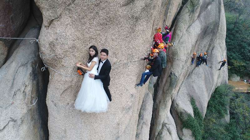 光滑的懸崖之上,情侶攀巖而上,僅憑繩索和鋼釬維系,驚險和難度系數(shù)絕對秒殺各類婚照,為他們留下了最驚心動魄和難忘的瞬間,真是應(yīng)了那句“問世間,情為何物?直教生死相許。”