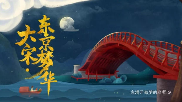 隨著小船的緩慢行駛,穿過虹橋、上善門等東京地標,半城水流載著一葉扁舟緩緩駛?cè)脬炅撼,岸上的人群、橋上的舞蹈、萬國的朝賀,隨著船行的方向逐頁播放,鐵馬金戈、戰(zhàn)火繚亂,一個朝代的興亡在潺潺的流水中漸次更迭…這就是清明上河園已經(jīng)上線的H5《大宋·東京夢華》。