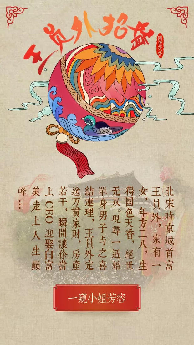 與手繪《大宋·東京夢華》H5純展示功能不同,《王員外招婿》H5更注重與游客的互動,并且采用時下最流行的直播形式進行創(chuàng)意衍生。