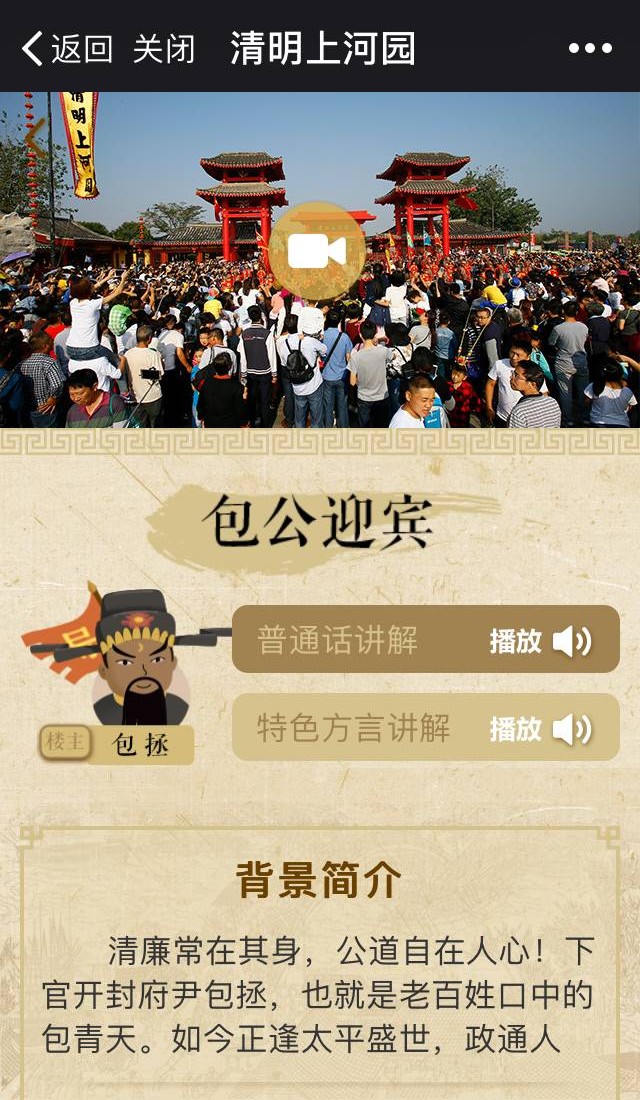 “宋徽宗”為游客解說大宋的科舉制度;“包公”邀游客一同斷案辨是非;張擇端親自講瑰偉建筑;“李逵”帶游客見識梁山好漢的義氣……宋代名人輪番上陣,用詼諧幽默的語言,讓每一位游客在講解中輕松暢游清明上河園,致力于讓游客玩的深一點,懂得多一點,充分利用語音導(dǎo)覽智慧產(chǎn)品厚重的宋文化感染到更多游客。