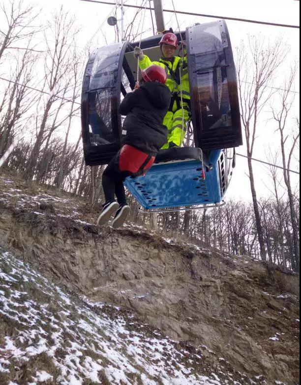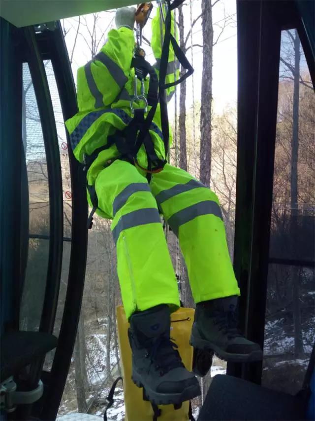 13時(shí)35分,主救人員跨上吊箱頂,并迅速進(jìn)入吊箱內(nèi)。主救人員首先對(duì)被困人員進(jìn)行心理安撫,隨后在地面工作人員的幫助下,將被困游客用安全救援繩索緩緩地滑向地面。