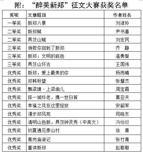 在本次征文大賽中,劉淑玲憑借作品《新鄭八景》奪得本次大賽的第一名,尹書喜、劉宏民榮獲二等獎,三等獎得主是喬靜、溫勇智、王國偉。楊雨晴等10名選手獲得優(yōu)秀獎。