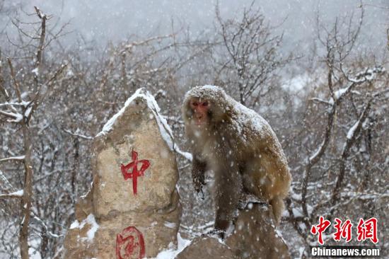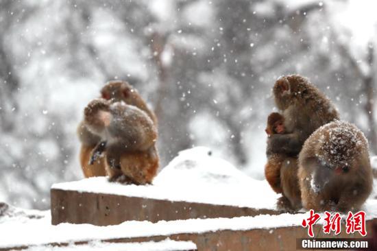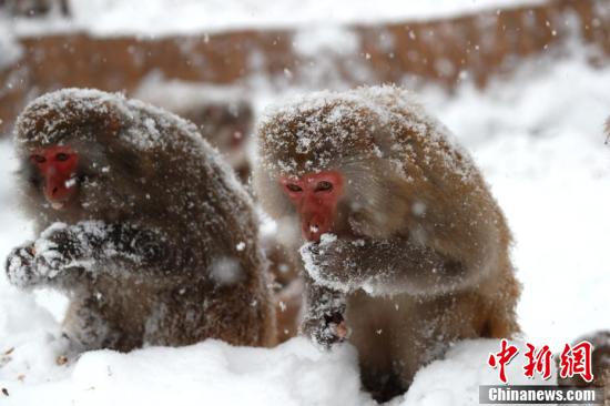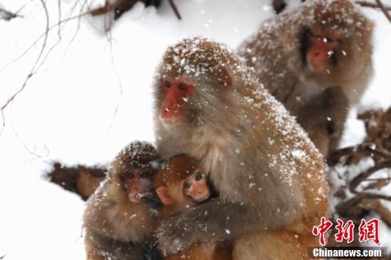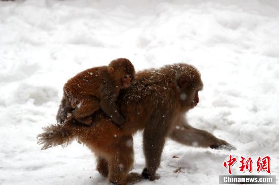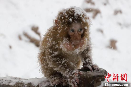 獼猴披雪成“雪猴”。