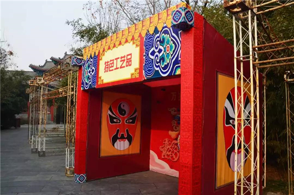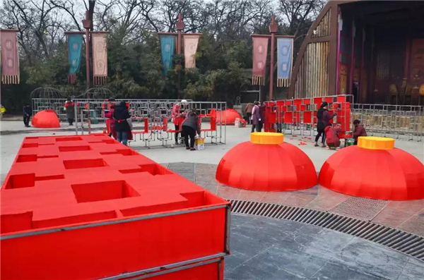 中門廟會氣氛產(chǎn)品制作現(xiàn)場井然有序,2018廟會期間全園區(qū)將實現(xiàn)多元化、多主題的氣氛造型分區(qū)設計。