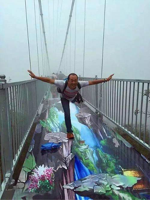 白天,站在玻璃橋上,下面的山石樹木都能看得清清楚楚,人好像懸在空中一樣。想象一下,你走在一座全透明的橋上,橫跨于山峰之間,上面是仙境般的美景,腳下是萬丈山谷,講真想想腿都有點(diǎn)軟,不過上橋來你應(yīng)該會(huì)覺得很爽吧。畢竟低頭就能俯瞰綿延的山川,云霧蒸騰就在腳下。