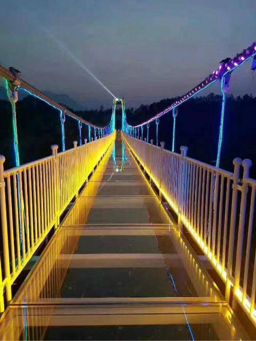 到了夜晚,玻璃橋上更是色彩斑斕,與不遠(yuǎn)處造型多變的燈光秀、活力四射的滑雪場遙相呼應(yīng),如同身臨海市蜃樓般的仙境,奇哉妙哉!