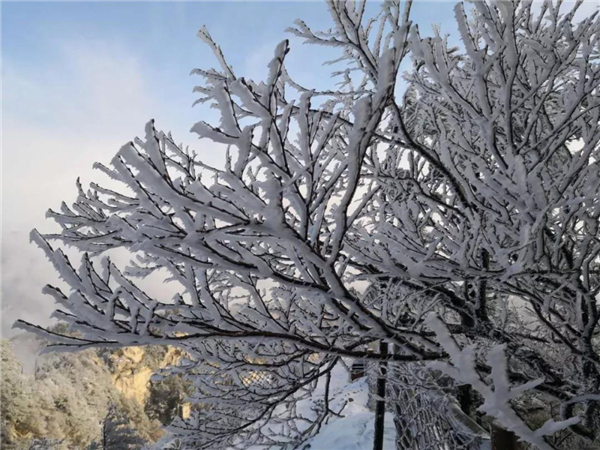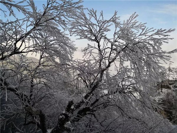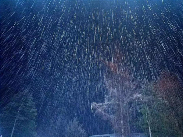 三月桃花雪是迎春的序曲,豐年的旭兆。此時(shí)漫天飛舞的雪花,不再預(yù)示著寒冷,雪花落在臉上,輕柔而又清爽的感覺,落在樹上,粘在枝丫上形成霧凇、樹掛,觀遠(yuǎn)處的山頂已是白雪皚皚,銀裝素裹的世界,給人以人間仙境的視覺沖擊感。