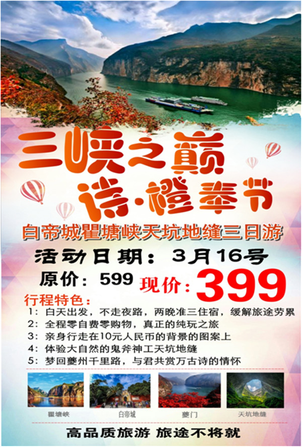 奉節(jié)縣旅游資源豐富,縣內(nèi)景觀以長江為軸線,向南北兩翼展開,其獨特的地質(zhì)地貌和悠久的人文歷史,形成了豐富的旅游資源,除了傳統(tǒng)的歷史人文景觀白帝城●瞿塘峽以外,赤甲集團(tuán)正大力開發(fā)南北兩岸旅游資源,北岸以三峽之巔旅游文化產(chǎn)業(yè)集群為核心,開發(fā)了三峽之巔自駕徒步產(chǎn)品,南岸以九天龍鳳養(yǎng)生度假旅游產(chǎn)業(yè)集群為核心,開發(fā)了天坑地縫、九盤河、龍橋河、金鳳山、百草園環(huán)線等旅游產(chǎn)品。同時赤甲集團(tuán)投資4個億由張藝謀導(dǎo)演策劃的大型山水實景演出《歸來三峽》將于2018年10月在白帝城景區(qū)開演。