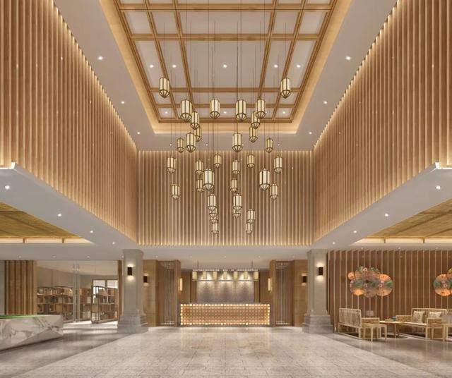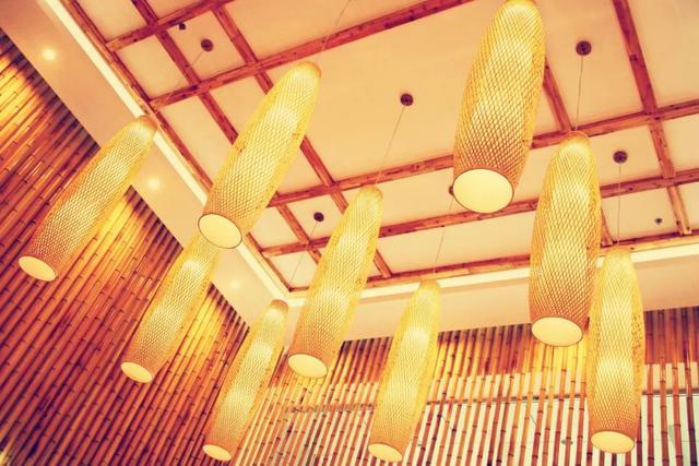 木色的空間,溫暖、閑適、自然。頂面由錯(cuò)落的竹竿組成的巨型藝術(shù)裝置形成大堂的視覺(jué)焦點(diǎn)。奪人眼球竹質(zhì)的隔斷,透著微微的光虛實(shí)之間,光影變換。