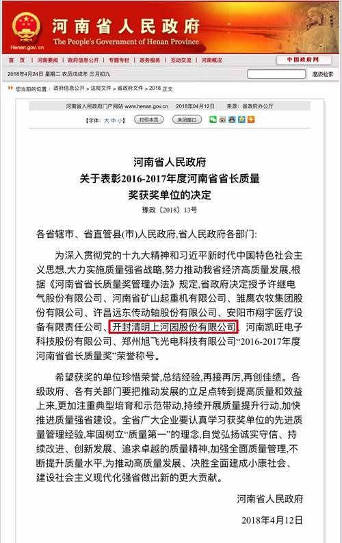 據(jù)了解,河南省省長質(zhì)量獎每兩年評審一次,是省政府設(shè)立的最高質(zhì)量榮譽獎,授予有廣泛的社會知名度與影響力、實施卓越績效管理模式、質(zhì)量管理水平和自主創(chuàng)新能力在國內(nèi)同行業(yè)處于領(lǐng)先地位、取得顯著經(jīng)濟效益和社會效益的單位。