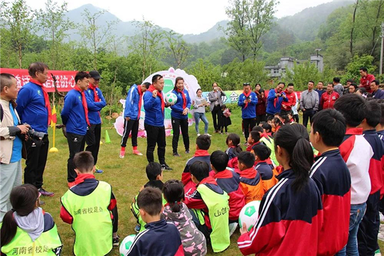 5月6日,“山娃足球”公益活動在欒川縣陶灣鎮(zhèn)協(xié)心村舉行,欒川縣副縣長鄒明武、欒川縣旅游工作委員會主任孫欣欣等領導出席活動儀式,并與山娃足球指導王隨生、鄭州日報文體部主任,鄭州市足協(xié)副主席王微晶,原河南建業(yè)足球隊隊長宋琦、原河南省女子足球隊隊長王瑛等公益人共同參與捐贈活動。陶灣鎮(zhèn)協(xié)心村開啟“體育+旅游+扶貧”新模式。