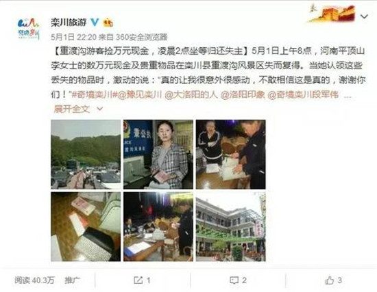 警察到達現(xiàn)場,查看包里有一萬七千多元的現(xiàn)金,還有2部手機和一把車鑰匙。5月1日的8點鐘,丟失東西的李女士趕到警務(wù)室認(rèn)領(lǐng)自己丟失的東西,確認(rèn)丟失的現(xiàn)金和手機及其他的貴重物品,一樣也不少。 河南省旅游資訊有限公司 主辦