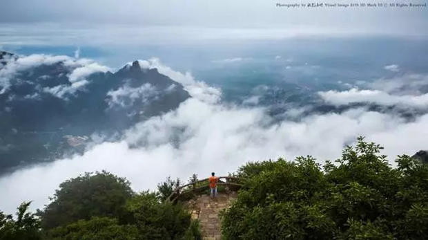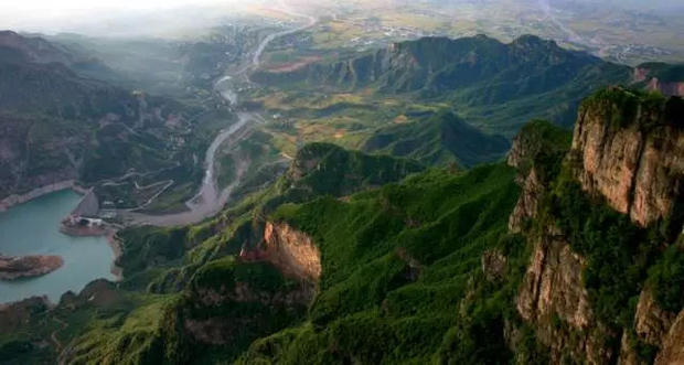 在關(guān)山觀(guān)景臺(tái),登高東望,極目遠(yuǎn)眺,群峰重巒疊嶂,依次遞減,漸漸消失在東方那一望無(wú)際的平原中。那蜿蜒起伏的山巒泛著濃濃的綠意,盤(pán)山公路恰似一條絲綢在山間蜿蜒飄舞,一處處村莊則像一顆顆灰色的珍珠撒落在一馬平川的大地……轉(zhuǎn)身西顧,仍有大山拔地凌霄,劈立千仞,峰柱陳列,驚怵回首,離天三尺,森嚴(yán)壁壘。它就像太行山神守護(hù)著黃土大地。更有花山群峰,在云端婀娜繚繞,若隱若現(xiàn),似群仙朝拜,飄逸端莊。