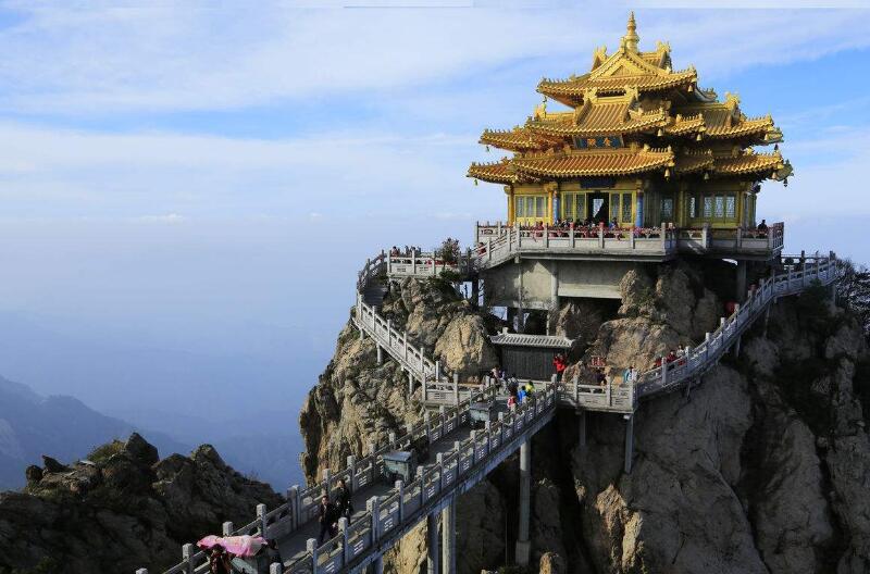 老君山金頂道教建筑群依托山頂建筑,主要包括老君廟、道德府、五母金殿、亮寶臺、玉皇頂、鐘鼓樓、南天門、朝陽洞、大道院、神道天橋、回廊等,全部采用明清皇家宮殿式建筑形式,特別是金殿、亮寶臺、玉皇頂三座金頂打造,成為老君山道觀群的亮點。中國旅游泰斗,著名旅游專家魏小安教授稱金頂為“天界五宮”。