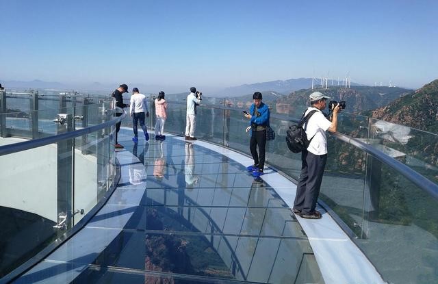 近日,伏羲山旅游區(qū)邀請媒體記者與少量游客體驗玻璃環(huán)廊,一睹險峻。游人行走橋面如漫步空中,透過玻璃橋面可俯瞰峽谷別樣風光。