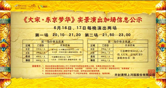 第一場:購《大宋·東京夢華》A區(qū)、B區(qū)票的游客加30元即可獲贈價(jià)值60元/人的《大宋·汴河燈影》游船體驗(yàn)券一張;購《大宋·東京夢華》貴賓票和御座的游客可免費(fèi)獲贈價(jià)值60元/人的《大宋·汴河燈影》游船體驗(yàn)券一張。