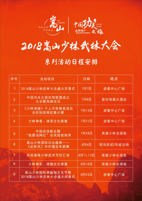 2018嵩山少林武林大會(huì),作為嵩山少林景區(qū)重磅推出的暑期大型線下品牌節(jié)慶活動(dòng),將以更具國(guó)際化的視角和更具文化性、互動(dòng)性、創(chuàng)意性和時(shí)代感的活動(dòng)內(nèi)容,精心策劃八大系列主題活動(dòng)。分別是中國(guó)功夫之旅自駕聯(lián)盟成立大會(huì)暨高峰論壇、《少林英雄》千人手勢(shì)舞表演及全民短視頻征集大賽、少林禪香、禪茶文化雅集、中國(guó)武俠歌會(huì)暨“我要當(dāng)網(wǎng)紅”全民短視頻秀、嵩山少林國(guó)際功夫盛典——《武林風(fēng)》中外擂臺(tái)爭(zhēng)霸賽、央視春晚少林武術(shù)節(jié)目匯演、少林禪樂(lè)、禪舞文化雅集、嵩山少林國(guó)際禪瑜伽文化節(jié)暨2018嵩山少林武林大會(huì)盛大閉幕式。