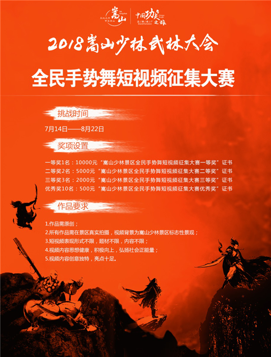 另外,本次嵩山景區(qū)全民短視頻大賽和傳統(tǒng)的比賽不同,本次大賽時(shí)間自7月14日起至8月22日止,以時(shí)下最受青年朋友喜愛的短視頻抖音創(chuàng)作為比賽內(nèi)容,創(chuàng)作空間大、參與性、娛樂性、互動(dòng)性強(qiáng)、不限年齡、不限國度、不限形式。只要你的《少林英雄》手勢舞視頻亮點(diǎn)十足、創(chuàng)意十足,人氣值爆棚,就有萬元大獎(jiǎng)等著你!活動(dòng)期間,凡在嵩山少林景區(qū)——嵩山少林牌坊、天下第一名剎牌坊、少林英雄會場地、山門、三皇寨等標(biāo)志性景點(diǎn),拍攝手勢舞視頻加關(guān)鍵詞上傳至抖音,就可參與評選!身懷絕技的“民間高手和網(wǎng)紅主播”們,快來嵩山少林武林大會秀出你的“神技能”,抖一抖你充滿創(chuàng)意的功夫表演,又或是展示你充滿熱血的江湖生涯!2018嵩山武林大會廣發(fā)英雄帖,邀您來戰(zhàn)!