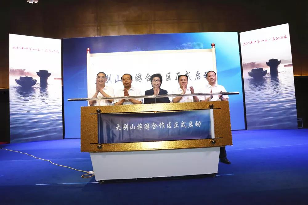 河南省旅游局副局長周耀霞,信陽市副市長邵春杰,信陽市旅游局局長童光亮,麻城市委書記楊遙,商城縣委書記李高嶺共同啟動“大別山旅游合作區(qū)”