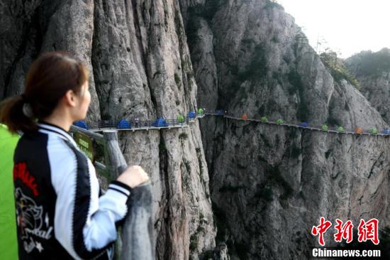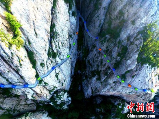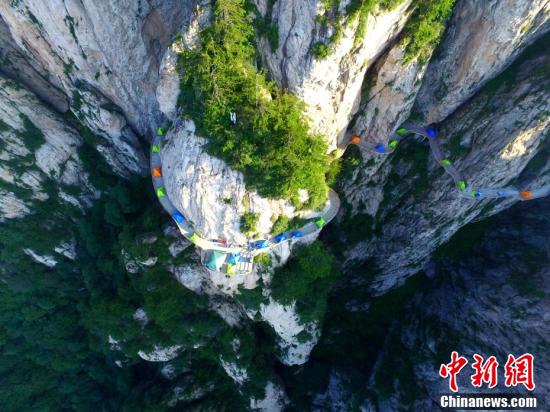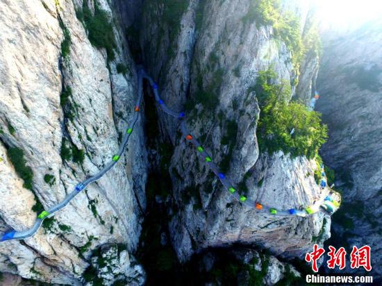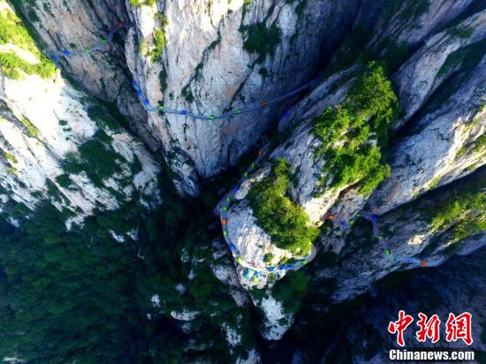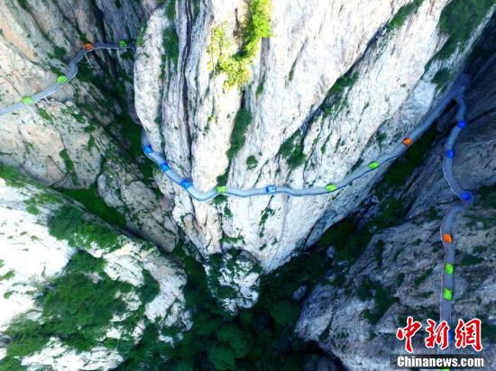 絢麗多彩的帳篷在千米懸崖棧道蜿蜒盤旋。