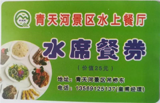 溫馨提示:所有水席就餐券一定要在青天河游客服務(wù)中心兌換(從其它門崗進入的游客不發(fā)放就餐券)。1.4米以下兒童若需就餐,按20元/人購買就餐券。