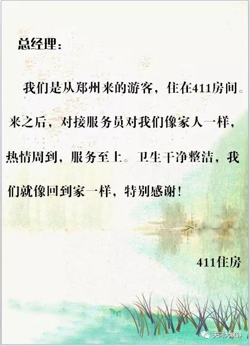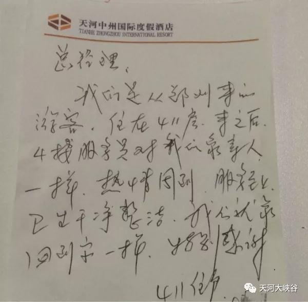 2018年7月22日早晨9點(diǎn),天河大峽谷中州國(guó)際度假酒店客房人員如往常一樣對(duì)房間進(jìn)行打掃的時(shí)候,無(wú)意間發(fā)現(xiàn)來自鄭州的游客留下一封感謝信,游客在信中為天河大峽谷工作人員熱情的服務(wù)態(tài)度和認(rèn)真的工作作風(fēng)點(diǎn)贊,字里行間,滿是感激之情。
