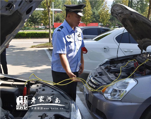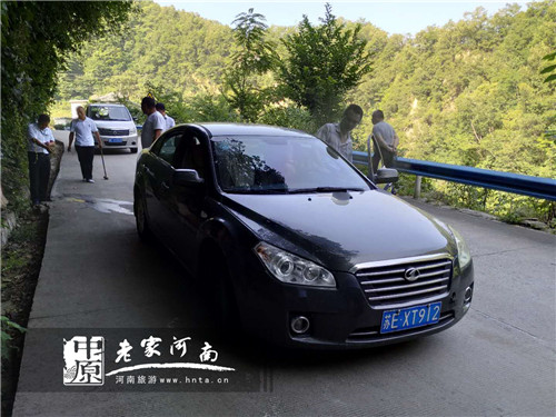 龍峪灣景區(qū)工作人員將駛?cè)肱潘疁宪囕v推出來