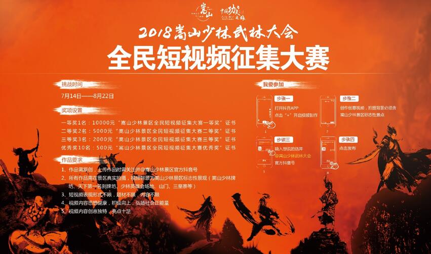 “我要當網(wǎng)紅”全民短視頻秀作為2018嵩山少林武林大會全民短視頻征集大賽的子活動,當天吸引數(shù)千游客現(xiàn)場大膽秀出他們的武俠情。據(jù)悉,2018嵩山少林武林大會全民短視頻征集大賽仍在火熱進行中,只要將你在嵩山少林景區(qū)標志性建筑前創(chuàng)作的創(chuàng)意視頻上傳至抖音,關注并@嵩山少林景區(qū),就可報名參賽。主辦方將對參賽作品進行統(tǒng)一評比,一等獎將獲得一萬元現(xiàn)金大獎!