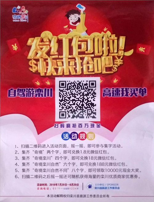 除了景區(qū)的優(yōu)惠活,在今年欒川高速免費活動一開始,欒川就發(fā)布了掃碼集字贏百萬紅包活動,只要您想辦法集齊 “奇境欒川·自然不同” 8個字,就有機會贏萬元現(xiàn)金,千萬商家優(yōu)惠!