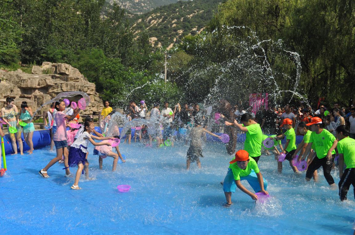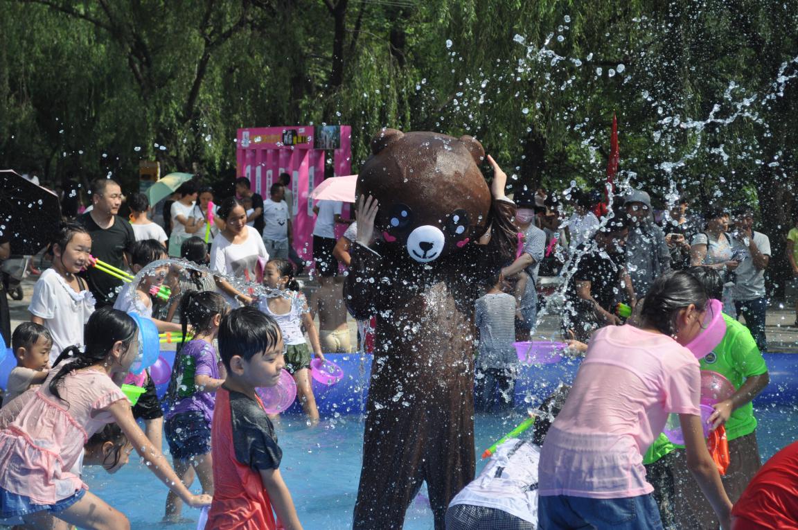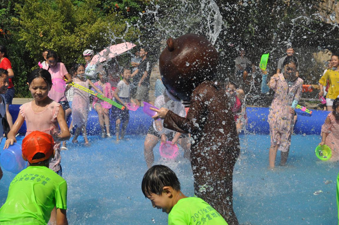 一個大大的充氣包里,蓄了很多水。大家?guī)献约旱耐昂团,你一勺、我一盆、他一桶?ldquo;還擊戰(zhàn)”“偷襲術(shù)”……大伙使出“十八般武器”,狠狠的向旁邊的人們送歡樂。調(diào)皮的網(wǎng)紅小熊,扭動著笨拙的身子,被潑得暈頭轉(zhuǎn)向,變成了一只“落湯熊”。雖然大家都渾身濕透了,但臉上都洋溢著開心的笑容。水聲交織著笑聲,在空中回蕩。遠處,藍天白云;近處,碧樹奔泉,構(gòu)成一幅美麗的畫。