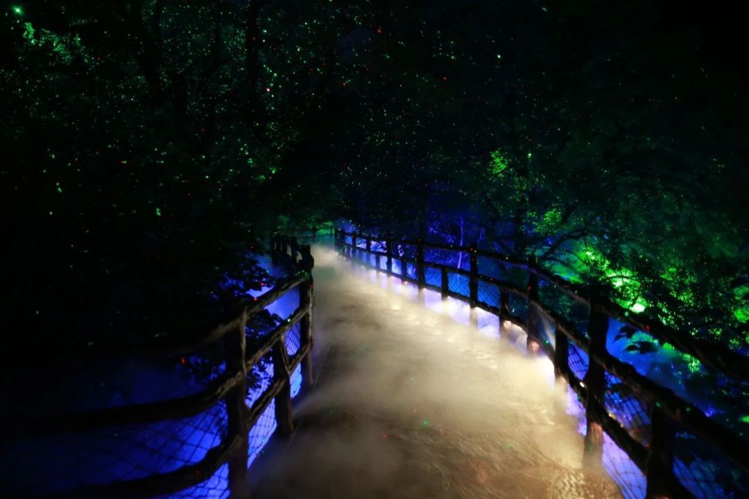 云臺(tái)山《云溪夜游》項(xiàng)目是運(yùn)用聲、光、電、全息投影等高科技手段,與自然山水深度融合打造的一場(chǎng)大型燈光夜景秀!对葡褂巍芬栽婆_(tái)山青龍峽青龍與民女的美麗愛(ài)情傳說(shuō)為主線(xiàn),在云溪谷中沿線(xiàn)塑造了“熒光海”、“夢(mèng)幻溪谷”、“龍飛蝶舞”、“海底世界”等多個(gè)3D奇妙場(chǎng)景,讓人猶如置身仙境一般。同時(shí)運(yùn)用水幕電影,為游客演繹一場(chǎng)“陪嫁村之戀”的美好愛(ài)情傳說(shuō),結(jié)合奇妙的光影互動(dòng),設(shè)置了“十步愛(ài)情走廊”、“雙子喊泉”、“幻光森林”等一系列創(chuàng)意亮點(diǎn),為廣大游客打造了一個(gè)獨(dú)具特色的網(wǎng)紅旅游體驗(yàn)項(xiàng)目。