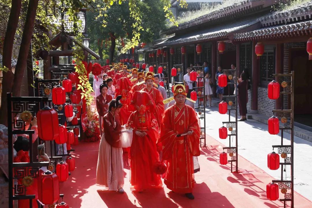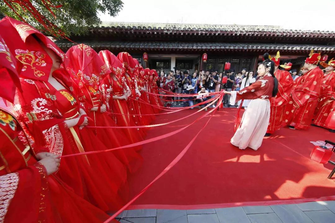 鑼鼓喧天轎臨門,五色彩棚接新人。只見(jiàn)遠(yuǎn)處10位新郎喜氣洋洋,在迎親隊(duì)伍的簇?fù)硐拢晞?shì)浩大的去迎親。