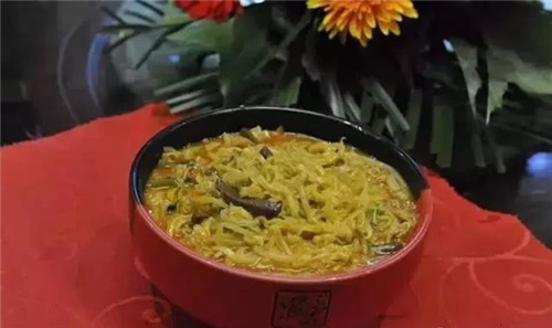 不同于陜西的羊肉泡饃,糊卜是一種單層的薄餅切成細絲,類似吃烤鴨的鴨餅。餅烙到七分熟,切細絲,放入羊湯中悶熟,配菜是綠豆芽。再加香油、蔥花、紅辣椒面等調(diào)料,油而不膩,滋補身體。