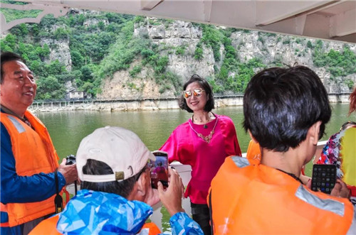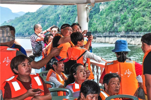 在豪華游船上,青天河秀美的景色讓來自南京的游客朋友們拍個不停。