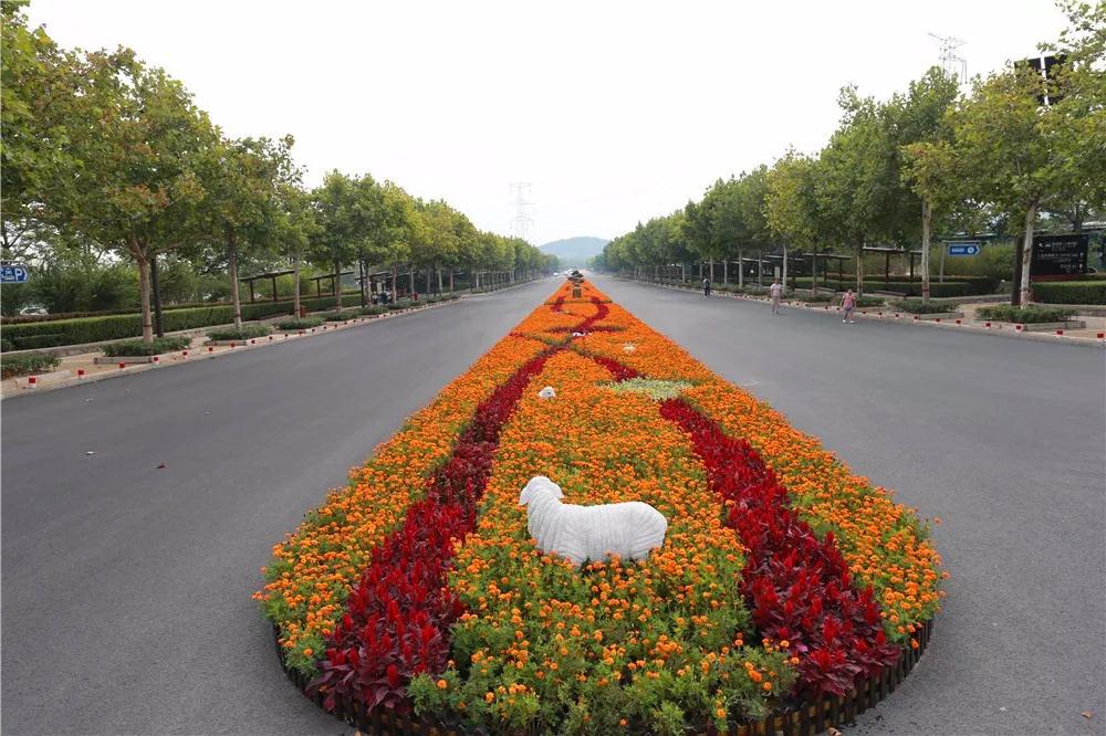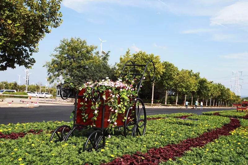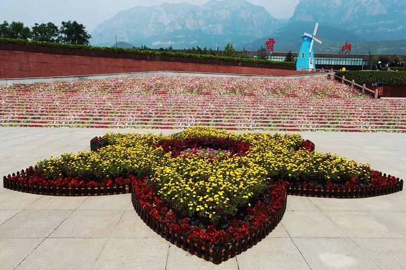巨幅紅石峽雙孔橋圖案和盛開的格桑花組成震撼的畫藝臺階,讓你每一步都走在花海里。