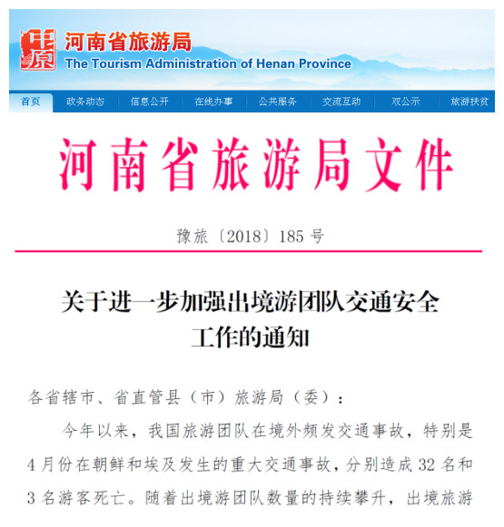 根據(jù)文化和旅游部辦公廳相關(guān)文件要求,近日,河南省旅游局出臺(tái)《關(guān)于進(jìn)一步加強(qiáng)出境游團(tuán)隊(duì)交通安全工作的通知》,要求全省旅游行政部門(mén)警鐘長(zhǎng)鳴,切實(shí)提高安全意識(shí),強(qiáng)化安全防范措施,進(jìn)一步做好出境游團(tuán)隊(duì)交通安全工作。