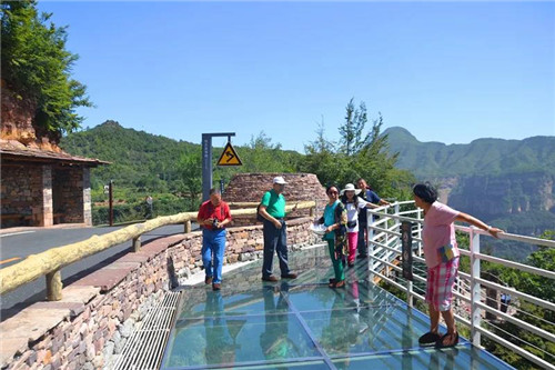 乘坐觀光車游走于太行天路,猶如置身百里畫廊,滿眼望去,無處不是大氣磅礴的國畫山水長卷,深邃的峽谷、直立的巖壁,帶給游客強(qiáng)烈的視覺震懾。結(jié)合山勢山形,太行天路沿線設(shè)置有10余座觀景臺,臨欄遠(yuǎn)眺,峽谷風(fēng)貌盡收眼底,領(lǐng)略到充滿陽剛氣概的太行風(fēng)骨。