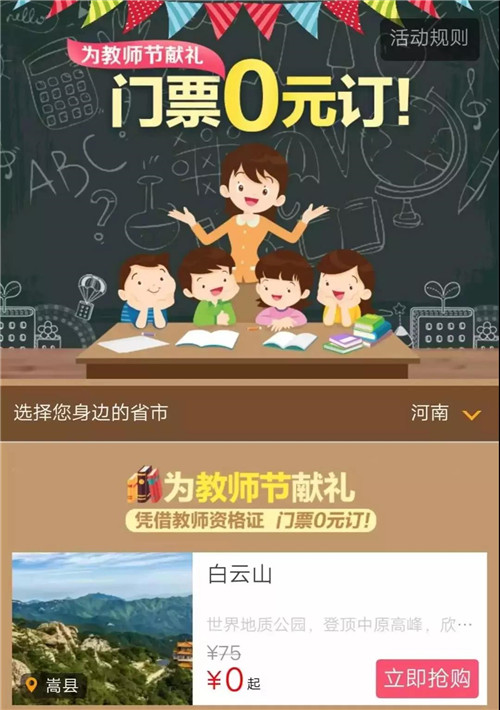 活動內(nèi)容:2018年9月8、9、10三日,登錄攜程網(wǎng),老師即可享受門票0元預(yù)定活動;顒悠陂g,教師憑本人教師資格證、攜程驗證短信,即可享受門票免費