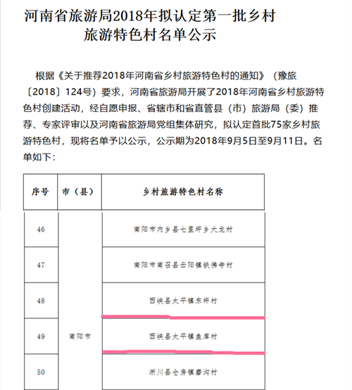近日,河南省旅游局發(fā)布了《2018年擬認(rèn)定第一批鄉(xiāng)村旅游特色村名單公示》,75個(gè)鄉(xiāng)村被公示。其中,西峽有2個(gè)鄉(xiāng)村被看上,榜上有名,分別是西峽縣太平鎮(zhèn)東坪村、西峽縣太平鎮(zhèn)魚庫(kù)村!作為城市后花園、旅游特色村,一定要在閑暇之余去逛逛,感受不一樣的美麗鄉(xiāng)村!
